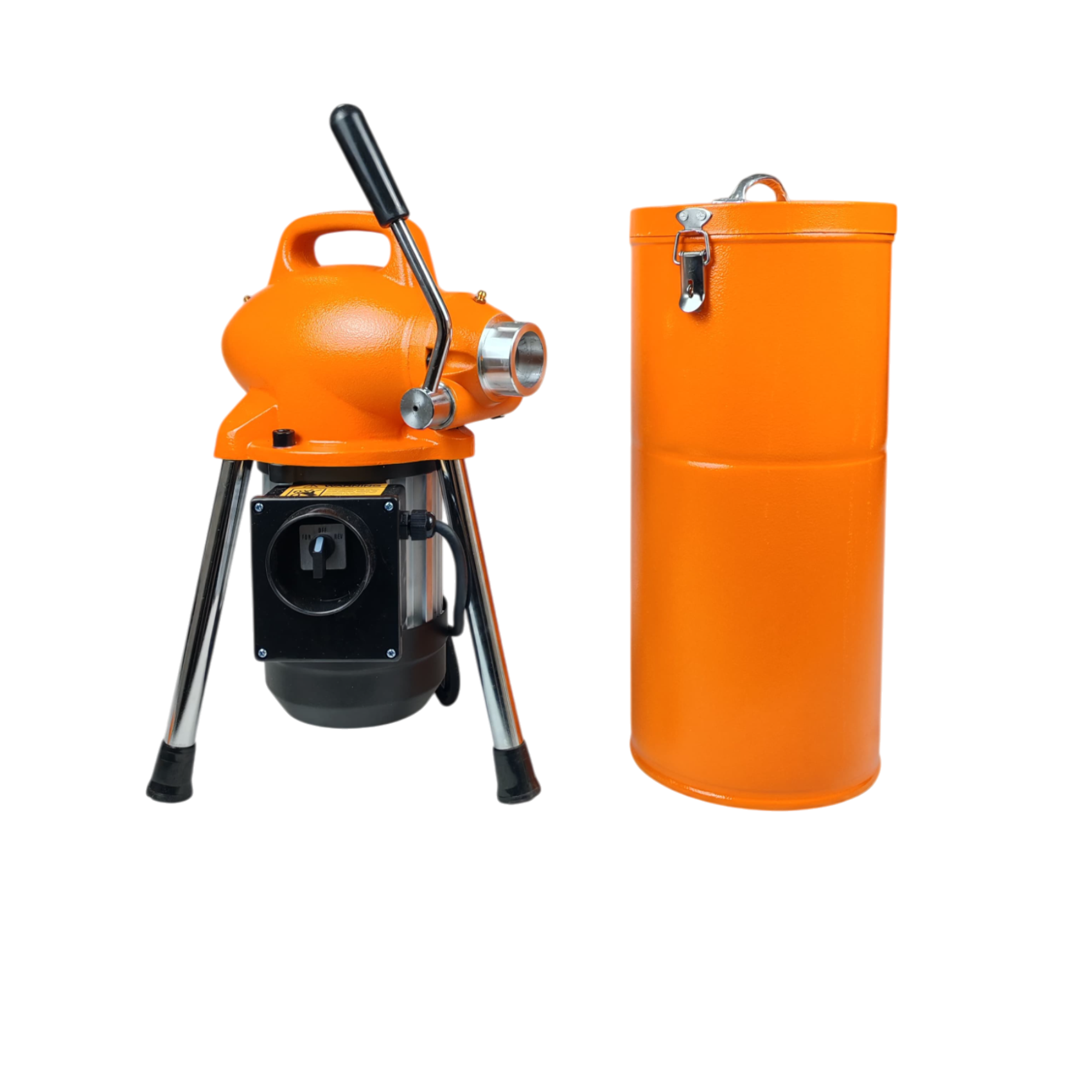 El contenedor rojo cilíndrico que almacena el cable de la serpiente de desagüe.
